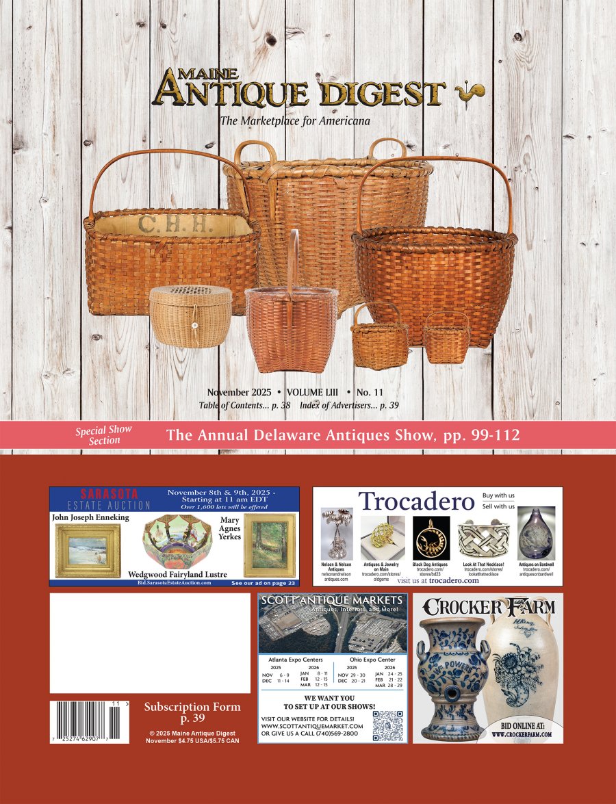 Published monthly, Maine Antique Digest covers the antiques and art market, particularly Americana. Each issue is packed with prices and pictures from shows and auctions from across the United States and Canada. Other features include market news, previews of exhibitions, book reviews, letters to the editor, club and association news, obituaries, and more. M.A.D.’s annual Antiques Trade Directory is published in December.